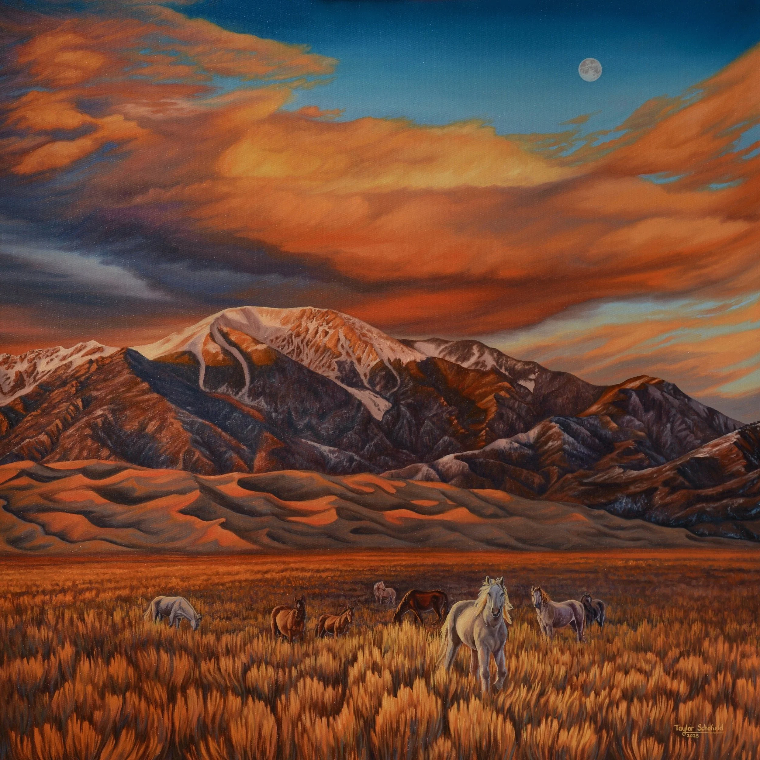 This painting depicts my favorite time of day, when the golden sunset light washes over the land, and the moon climbs steadily into the sky. I also chose to include a herd of wild horses, inspired by the wild herd of the San Luis Valley. I tried to create a sense of freedom and mystery in this painting, which I always feel when I visit this beautiful place.